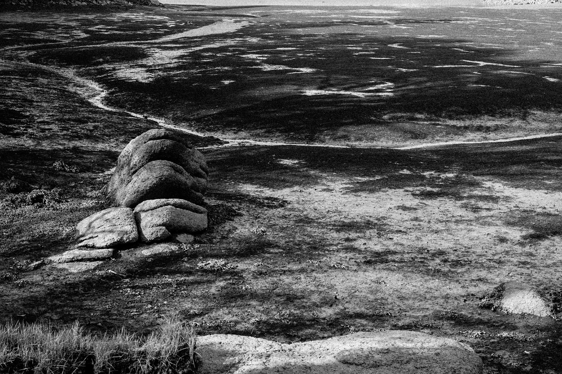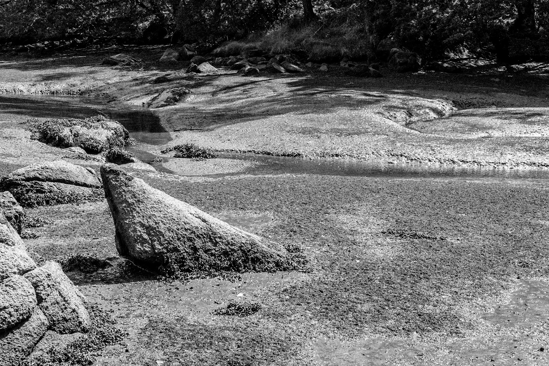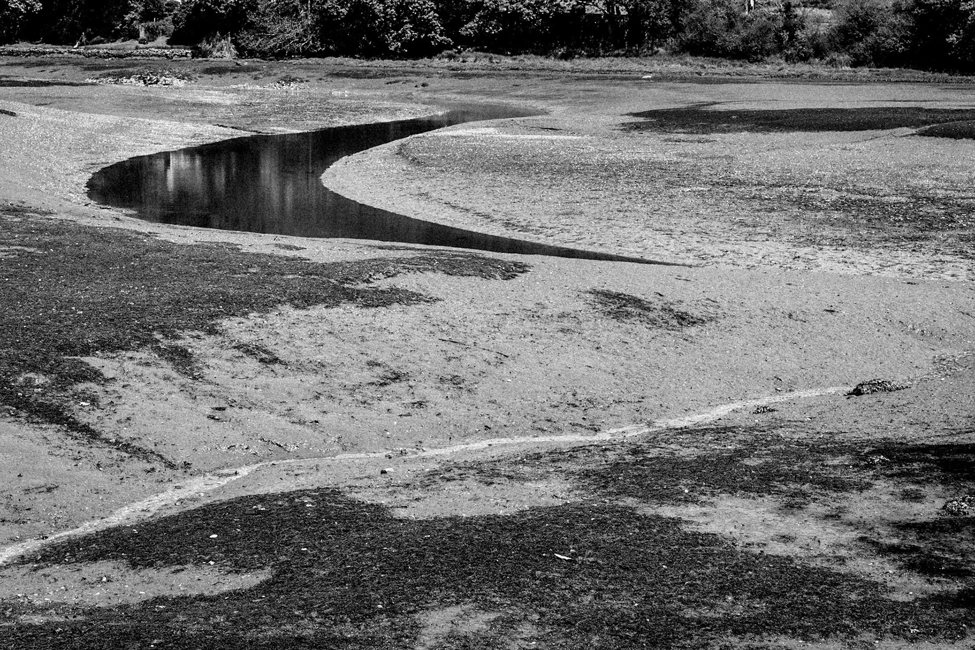 La ria de la rivière belon à marée basse, en Bretagne Sud. Un mince ruisseau qui sera bientôt recouvert par la mer, des courbes, des lumières... On pense à Prévert, "Démons et merveilles, vents et marées, au loin déjà la mer s'est retirée..."